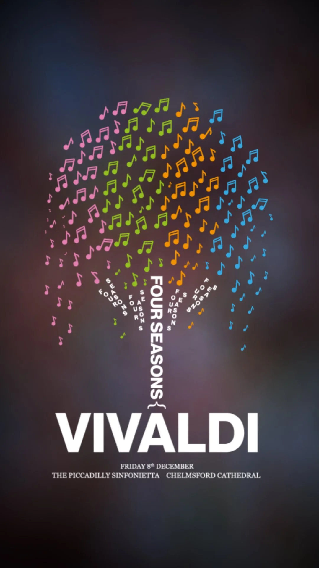 The idea was to represent the four seasons as a tree as this is a great representation of the changing seasons. The tree leaves are made from different coloured musical notes that represent the colours associated with the seasons. For the video posters, I took stock video of seasonal scenes and placed them as subtle backgrounds