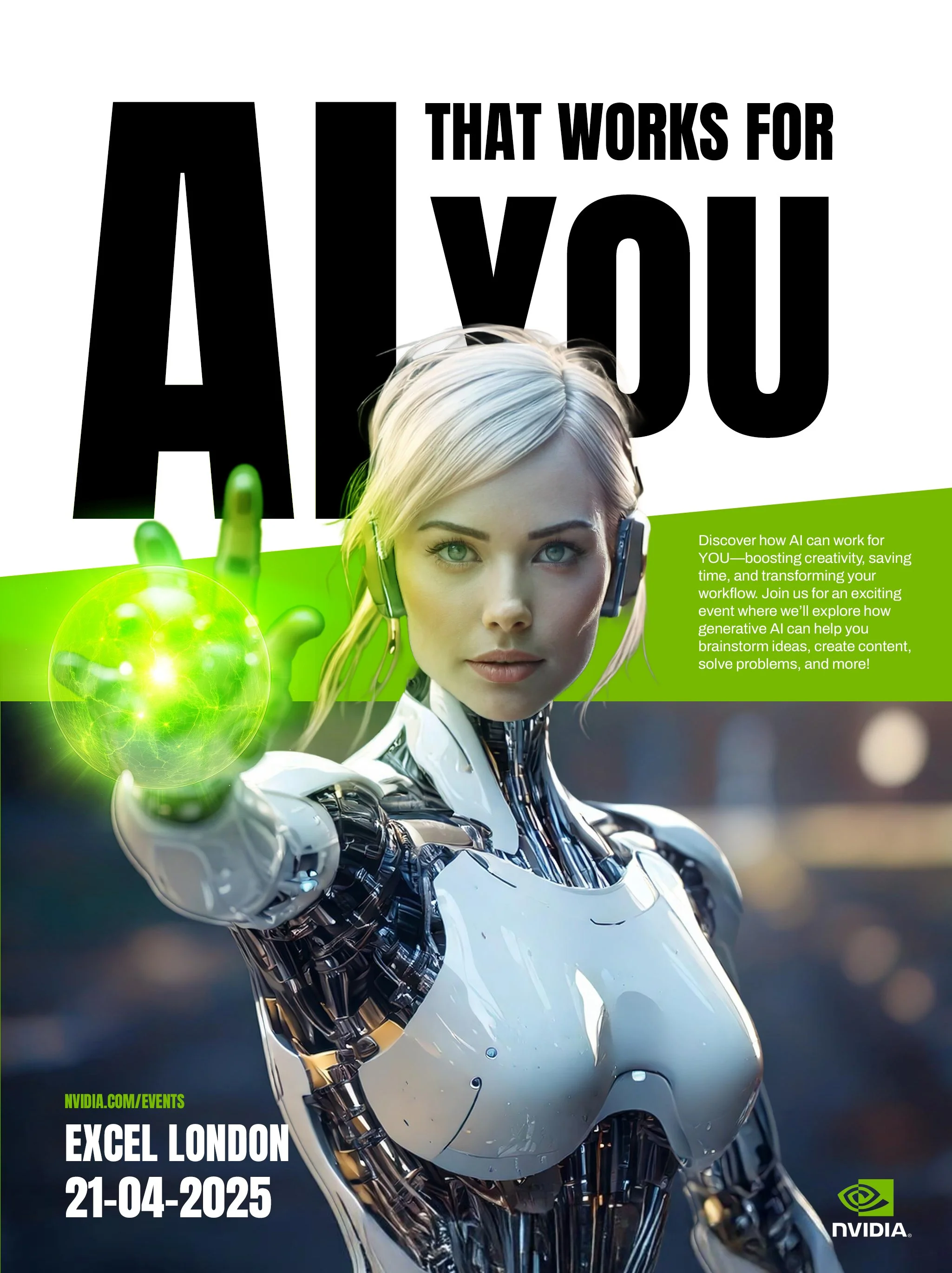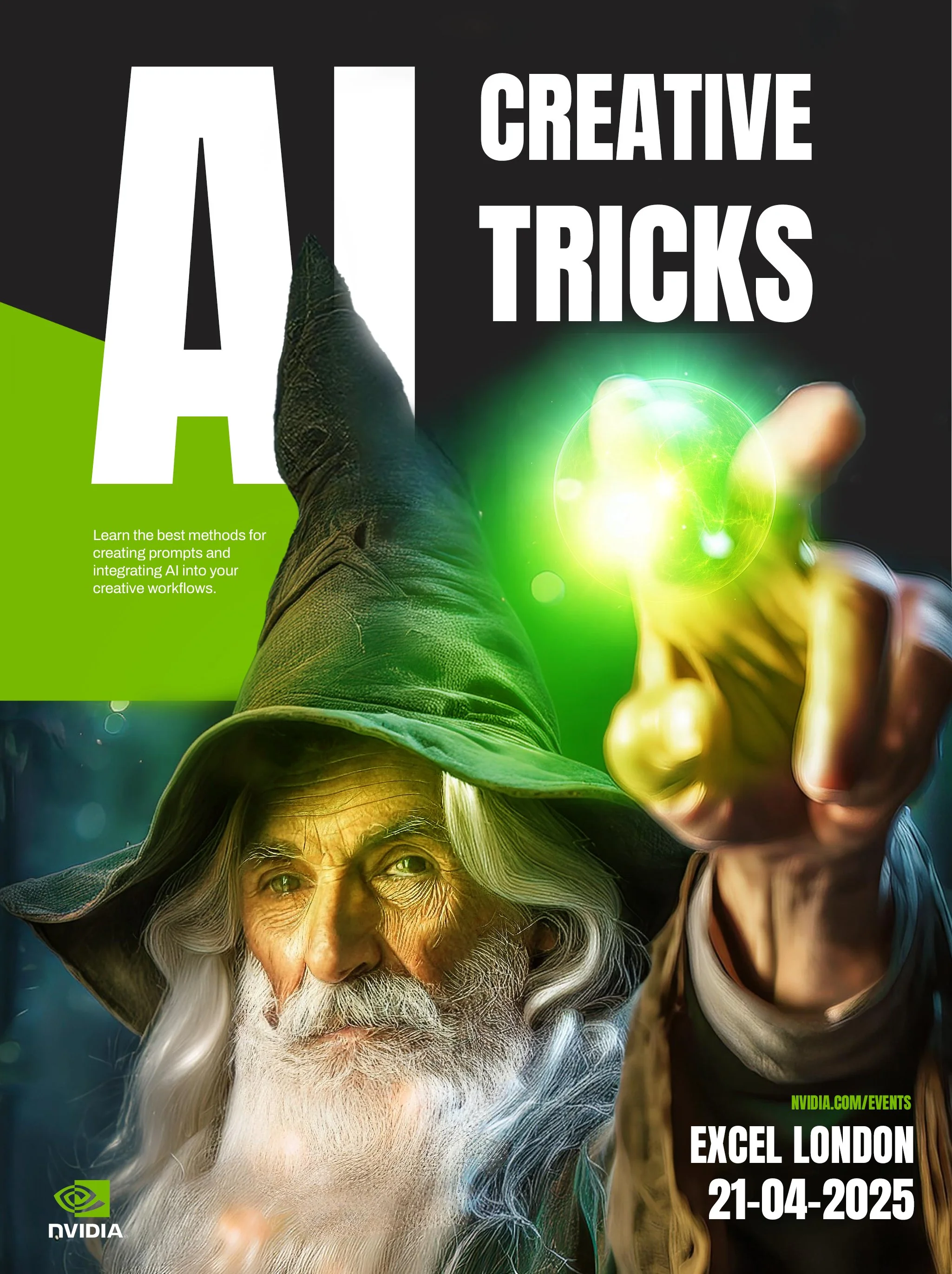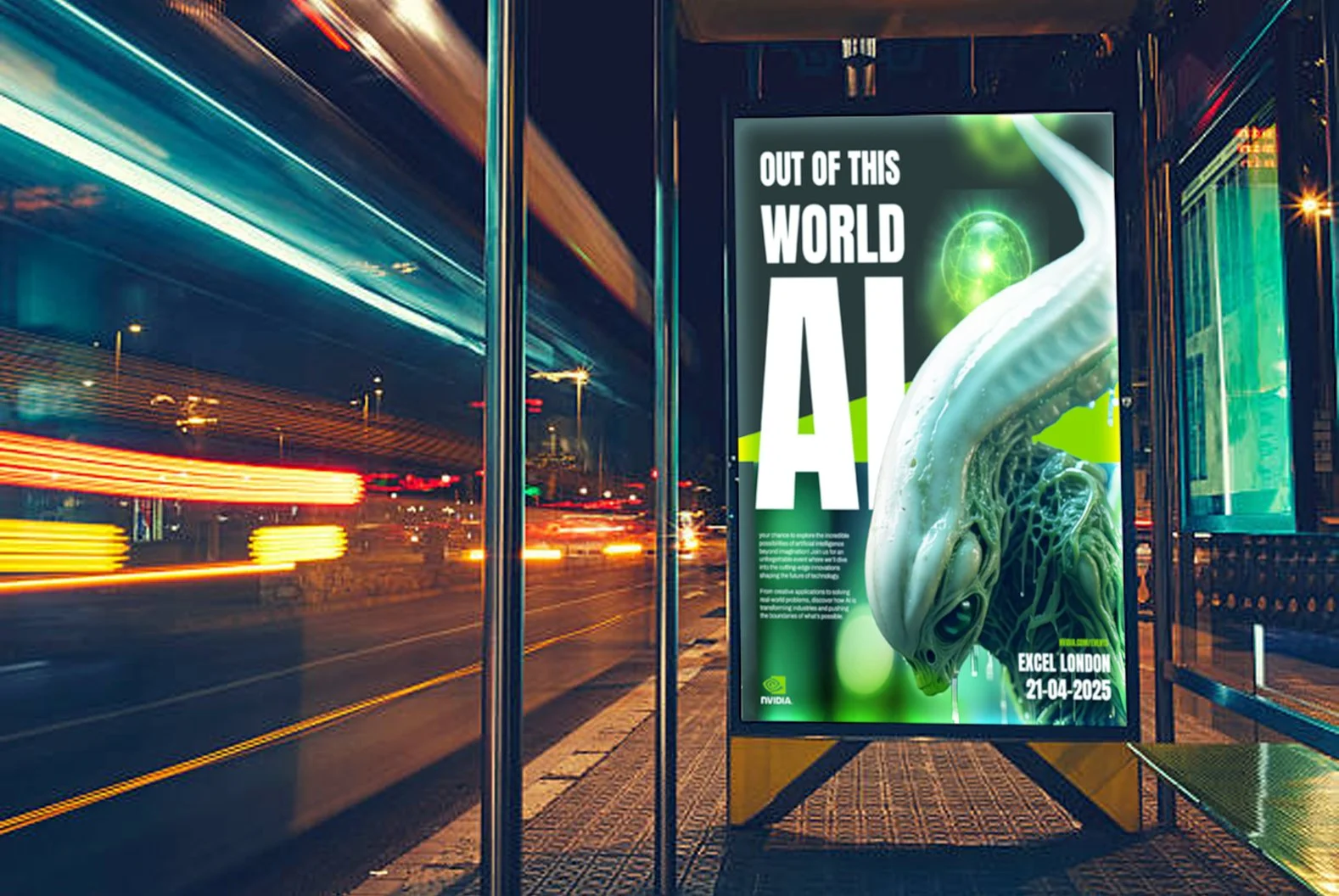 A series of events at London’s Excel to promote Nvidia as a major player in the realms of AI. I created a series of concepts for posters for their events with key art created using their AI tools.